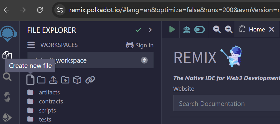 Create new file 을 눌러 .sol 파일을 생성한다.