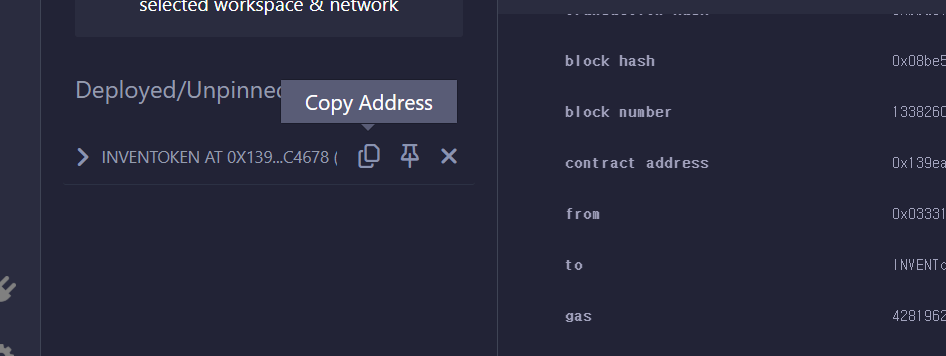 Debug 옆의 아래 화살표를 클릭해 contract address를 복사하거나, Deployed/Unpinned Contracts에서 복사 버튼을 누르면 된다.