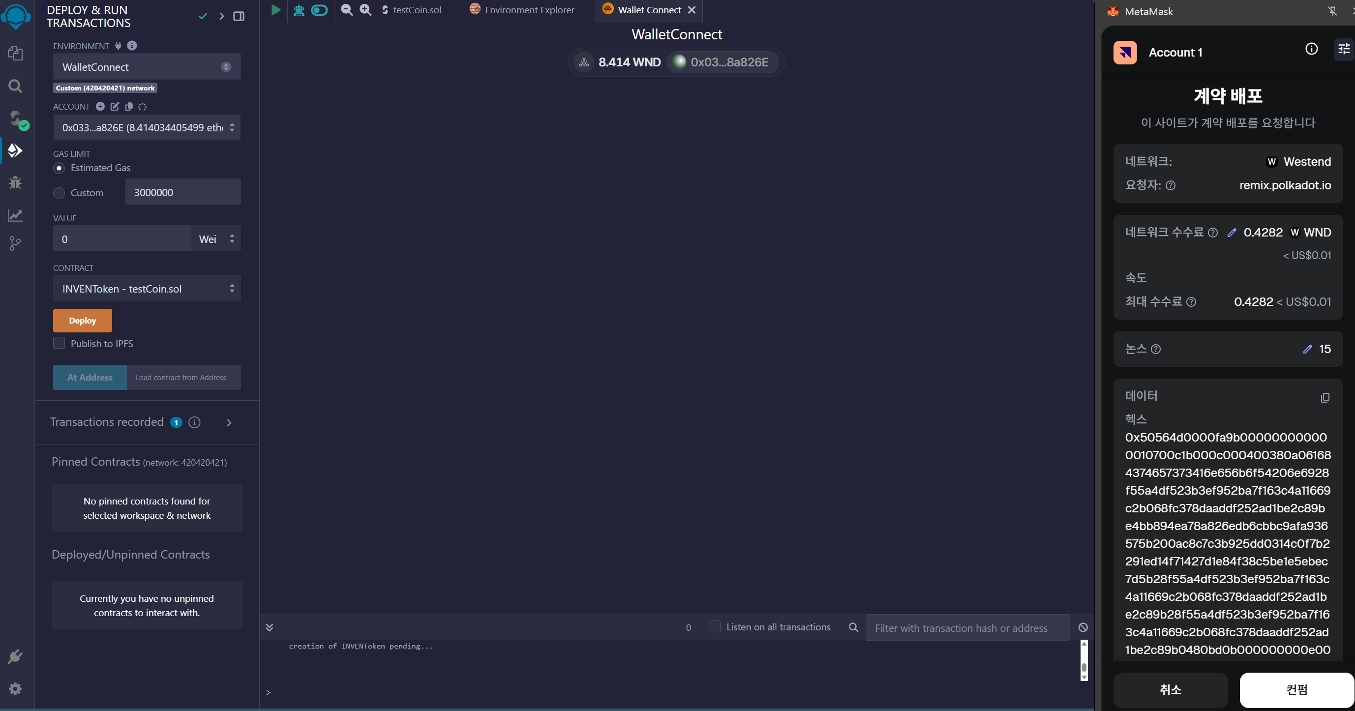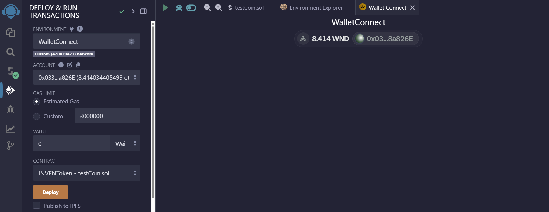 ENVIROMENT에서 메타마스크 지갑을 연결한다.