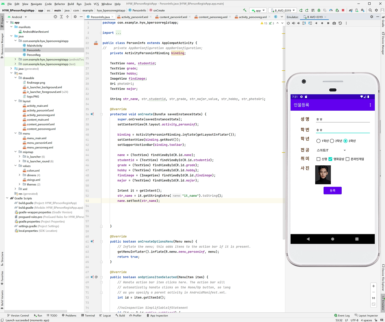 setContentView(R.layout.activity_main); 를 수정한다. (R.layout.activity_personinf);