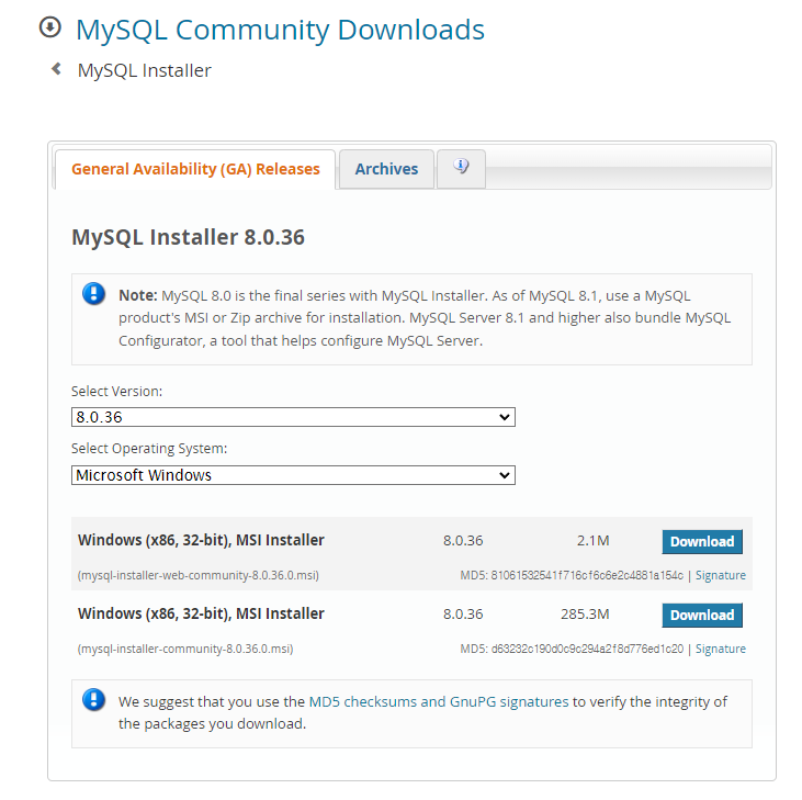 작업 환경을 노트북에서 데스크탑으로 바꾸게 되어 MySQL을 다시 설치하게 되었다. 설치 방법을 알아보자. 아래 링크에 접속해 MySQL을 다운로드 받는다. https://dev.mysql.com/downloads/installer/ MySQL :: Download MySQL Installer Note: MySQL 8.0 is the final series with MySQL Installer. As of MySQL 8.1, use a MySQL product's MSI or Zip archive for installation. MySQL Server 8.1 and higher also bundle MySQL Configurator, a tool that helps configure MySQL Serve..